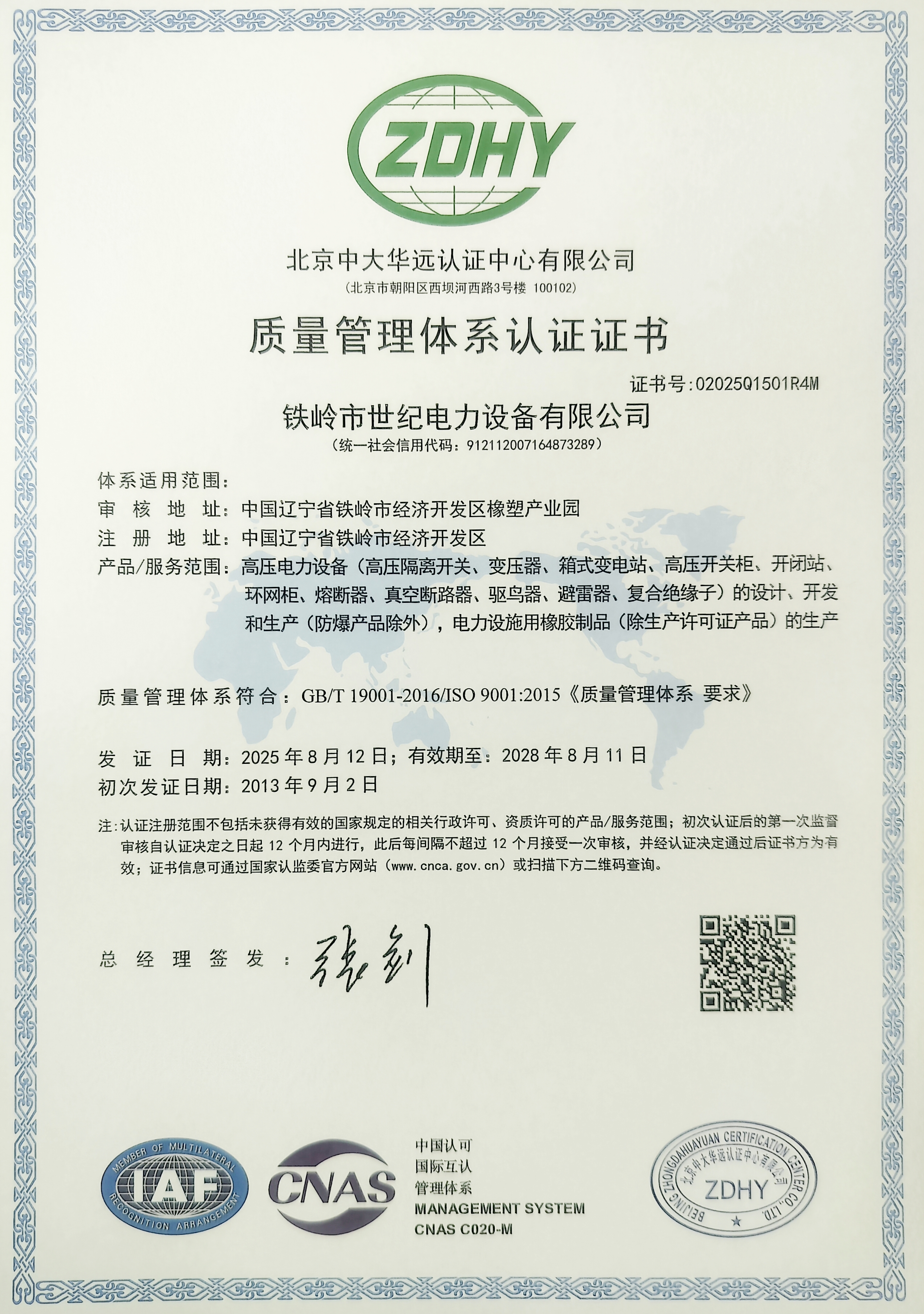 鐵嶺市世紀(jì)電力設(shè)備有限公司是集科研開發(fā)、生產(chǎn)制造、用戶服務(wù)于一體的國家高新技術(shù)企業(yè),始建于1999年,位于鐵嶺經(jīng)濟(jì)開發(fā)區(qū),占地面積5萬余平方米,建筑面積2萬余平方米。主要從事國家電網(wǎng)配套戶外高低壓隔離開關(guān)、電力電纜、變壓器成套裝置、高低壓開關(guān)柜、箱式變電站、絕緣子等產(chǎn)品的研發(fā)、生產(chǎn)和銷售。公司現(xiàn)有國家發(fā)明專利6項(xiàng)、實(shí)用新型專利9項(xiàng),公司通過了ISO9001國際質(zhì)量管理體系認(rèn)證、ISO14001環(huán)境管理體系認(rèn)證和ISO 45001職業(yè)健康安全體系認(rèn)證。